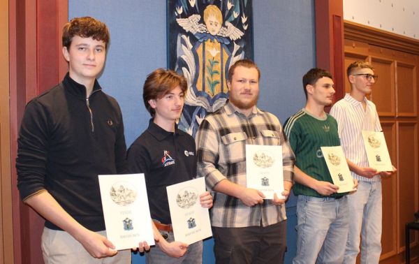 Jeremy Tulaszewski, Nicolas Wenzel, Lars Jonack, Albert Ceprakow und Florian Oehme (v. l.) sind fünf der sieben gewählten Jugendstadträte. Die beiden weiblichen Vertreterinnen, Marie Lehmann und Leni Kletzsch, konnten nicht anwesend sein und ihre Urkunden in Empfang nehmen. Foto: (Wsp) Phillipp